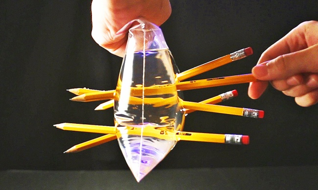 Пояснення: Якщо поліетиленовий пакет проткнути і потім залити в нього воду, вона буде виливатися через отвори. Але якщо пакет спочатку наповнити водою наполовину і потім проткнути його гострим предметом так, що б предмет залишився встромленим в пакет, то вода витікати через ці отвори майже не буде. Це пов'язано з тим, що при розриві поліетилену його молекули притягуються ближче один до одного. В нашому випадку, поліетилен затягується навколо олівців.