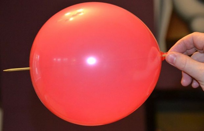 Пояснення: Секрет цього трюку простий. Для того, щоб зберегти кулька, потрібно проткнути його в точках найменшого натягу, а вони розташовані в нижній і у верхній частині кульки.