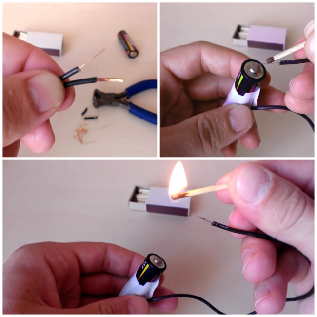Пояснення: торкаючись батарейки другим кінцем дроту, ви замикаєте ланцюг. Струм нагріває оголений провід — цього підвищення температури достатньо, щоб сірник загорілася.