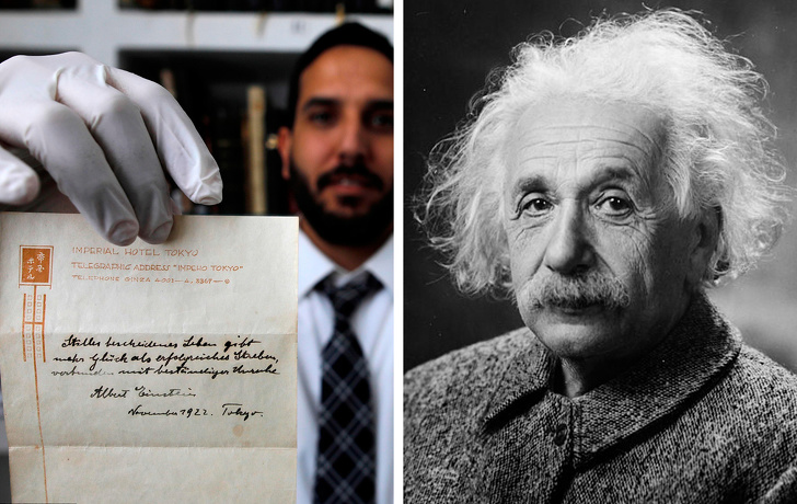 Альберт Ейнштейн був у номері готелю Imperial Hotel Tokyo, коли до нього в двері постукав кур'єр. Посильний приніс кореспонденцію. Ейнштейн хотів віддячити хлопця, але не знайшов у кишені купюри відповідного номіналу. Тоді вчений вирвав з блокнота два листка і на кожному зробив замітку на німецькому. Після чого вручив їх кур'єру зі словами: «Візьміть ці записки, через деякий час вони стануть набагато цінніше звичайних чайових».