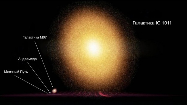 Однак наша галактика — коротун порівняно з деякими іншими. Ось Чумацький Шлях порівняно з IC 1011.