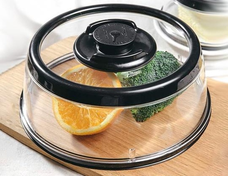 За допомогою такої кришки ми з легкістю запечатаем у вакуумі будь-які продукти або страви, причому в будь-якому посуді — на тарілці, в мисці, в сковороді або каструлі.