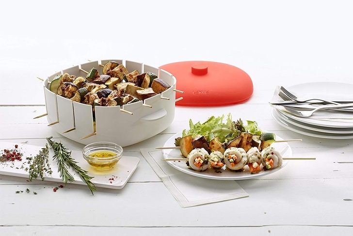 За допомогою цього пристосування можна приготувати цілу партію різноманітних шашликів, навіть якщо у вас немає гриля або духовки — досить мікрохвильовій печі. Шашлики будуть готуватися на пару, без олії.