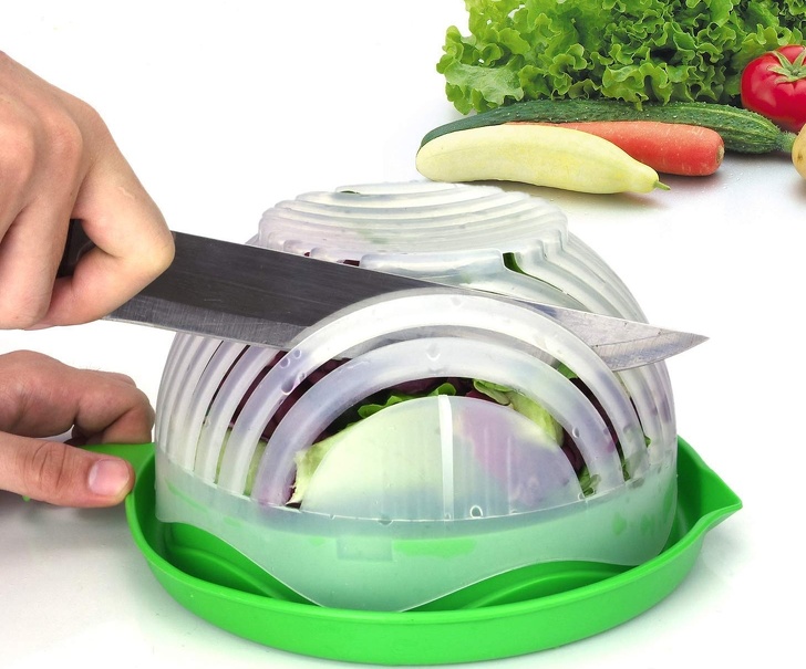 У це геніальне пристосування поміщаються всі овочі, фрукти і зелень, з яких ми хотіли б приготувати салат. Продукти нарізаються через прорізи, потім кришка повертається і вміст подрібнюється ще раз. І так до тих пір, поки все не буде нарізано так дрібно, як нам подобається.