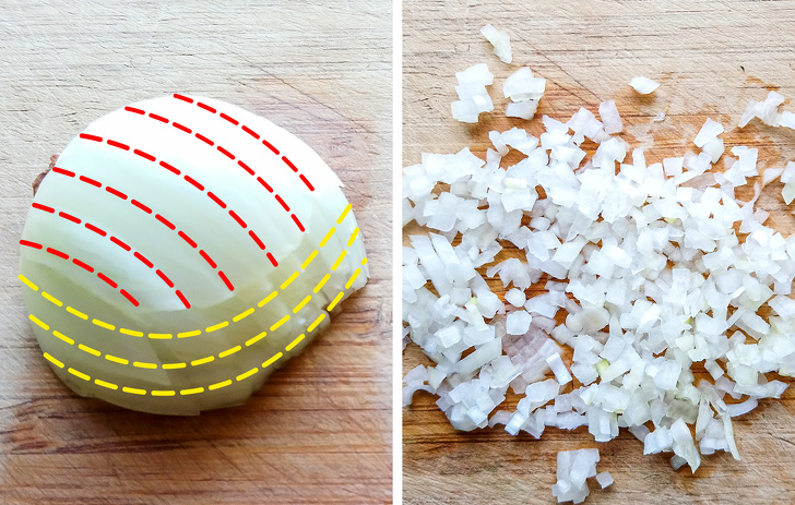 Порада: щоб швидко і красиво нарізати цибулю, розділіть цибулину на 2 частини, потім зробіть декілька паралельних надрізів перпендикулярно хвостика — ширина залежить від того, якого розміру вам необхідні кубики. І нарешті надріжте паралельно дошці, ведучи ніж трохи вниз.