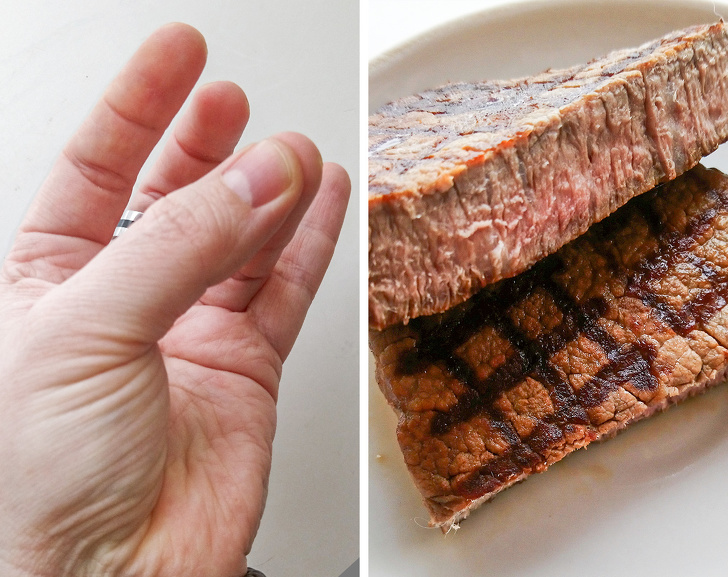 Порада: щоб зрозуміти ступінь прожарювання стейка, складіть пальці певним чином, а потім натисніть на «подушечку» під великим пальцем. Потім натисніть на приготоване м'ясо, і якщо ступінь пружності буде такою ж, як на руці, ви отримали потрібну просмажування.