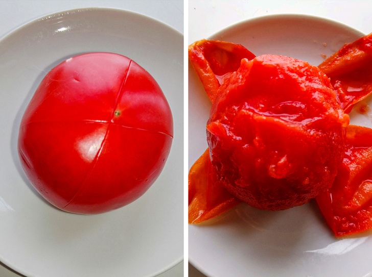 Порада: щоб зняти шкірку з помідорів, зробіть хрестоподібні надрізи і помістіть їх в киплячу воду. Через хвилину перекладіть томати в крижану воду, щоб вони не стали вареними.