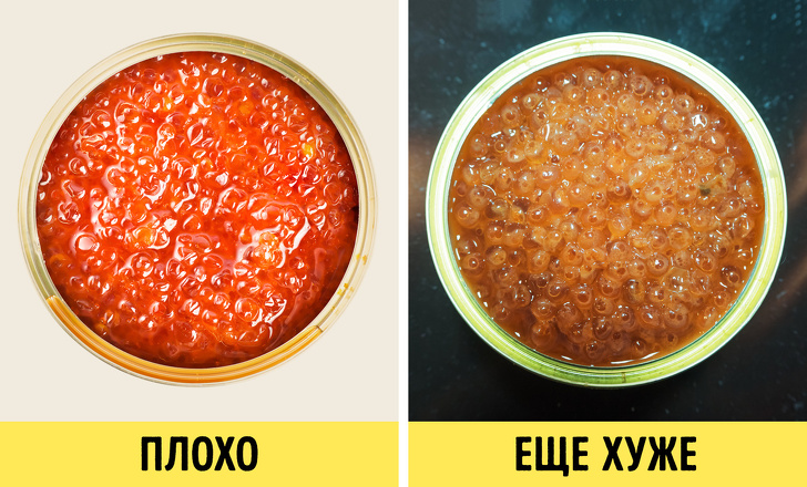 В жерстяній закритій банці ніяк не можна побачити консистенцію ікри, але можна перевірити якість іншим способом. Злегка потрясіть банку з ікрою і прислухайтеся до звуку: якщо ви чуєте булькання — значить, розсолу всередині більше, ніж самої ікри. Такий продукт не підходить для покупки.