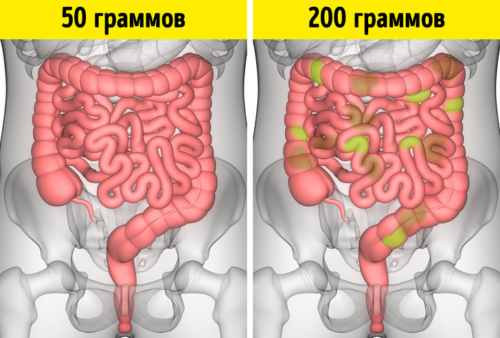 Людині вагою 70 кг потрібно не більше 100 г білка в день, при цьому необов'язково, щоб весь білок був тваринного походження. Що стосується м'яса, то дієтологи радять віддавати перевагу рибі і птиці. А ось червоне м'ясо бажано не більше 2 разів на тиждень. Якщо вживати її щодня в кількості більше 100 м, це може негативно позначитися на здоров'ї. В першу чергу, виникнуть проблеми з травленням. По-друге, підвищиться рівень сечової кислоти, як наслідок, з'являються камені в нирках. По-третє, м'ясо перетравлюється від 5 до 7 годин, з-за чого в кишечнику виникають гнильні процеси. Тому печінці і ниркам доводиться працювати на межі, щоб убезпечити організм, а це погано позначається на їх стані. Крім того, було виявлено, що м'ясоїди частіше хворіють на діабет і рак товстої кишки.