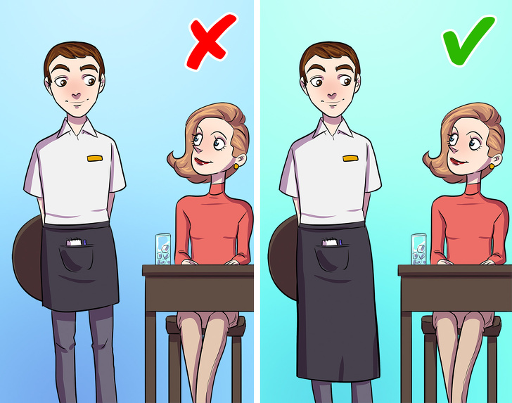 - Перше враження про офіціанта ви можете скласти ще до замовлення. Якщо він перебуває у залі і розважає бесідою бармена, навряд чи можна розраховувати на його високу кваліфікацію. У серйозних місцях розмови не про роботу між персоналом в залі заборонені.