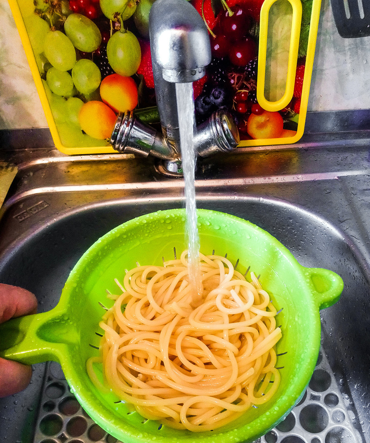 Промивати макаронні вироби можна і навіть потрібно в одному випадку: коли ви не плануєте негайно подати їх на стіл. Перекладаючи ще гарячі спагеті або ріжки відразу після приготування в посуд для зберігання, ви ризикуєте отримати переварений продукт, оскільки він буде «доготавливаться» під дією власної температури. Звичайно, не варто довго залишати пасту під струменем води — досить просто її охолодити.