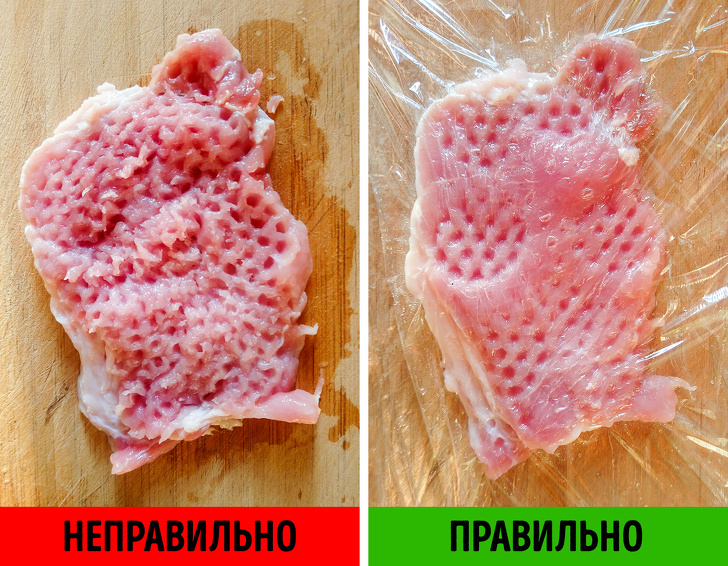 Перед тим як відбити м'ясо, обов'язково застеліть робочу поверхню харчовою плівкою і накрийте нею ж майбутній шніцель або відбивну. По-перше, так мікроскопічні шматочки м'яса не будуть забивати пори дошки (особливо якщо мова йде про дерев'яної), по-друге, вони не потраплять на навколишні предмети. І, мабуть, найголовніше — відбиваючи м'ясної шматок без прокладеної між ним і молоточком плівки, ви порушуєте цілісність м'язових волокон, фактично перетворюючи свинину чи яловичину в фарш.
