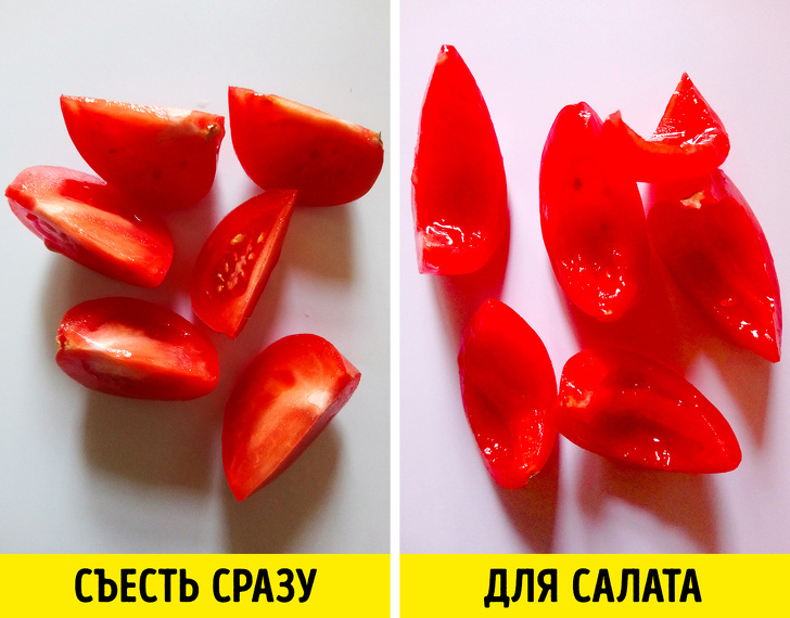 Це стосується салатів зі свіжих овочів, навіть якщо ви їх подаєте на стіл відразу ж після приготування. Як правило в ресторанах у помідорів і огірків видаляють насіння, які і дають непотрібну рідину, особливо якщо салат заправлений сіллю. Якщо ви готуєте страву з солоними або маринованими огірками, то їх додатково потрібно злегка віджати — не занадто сильно, щоб не зашкодити зовнішньому вигляду, але достатньо, щоб позбутися значної частини впитавшегося в них розсолу.