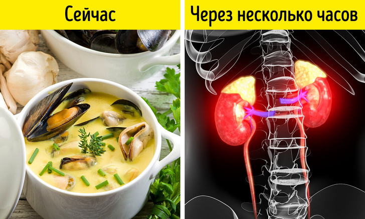 Вершковий соус і морепродукти - таке поєднання може стати причиною тяжкості в шлунку аж до відчуттів, що нагадують отруєння. Причина в тому, що при зустрічі двох різних видів білка відбувається передозування організму протеїнами і він просто не справляється з таким навантаженням. Виникає важкість у шлунку, нудота, може бути ускладнення на нирки, особливо якщо до цього є схильність.