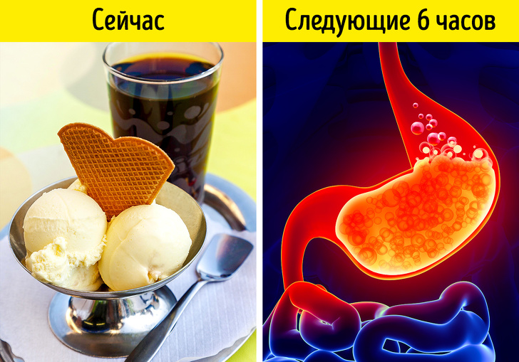 Улюблене поєднання дітей при поході в заклади фаст-фуду виявляється найбільш небезпечним для них же. Хоча і дорослий шлунок погано переносить цей «тандем». І якщо у здорових людей після такого перекусу може багато години (до 6 годин) зберігатися сильне здуття і тяжкість в животі, то у тих, хто страждає діабетом, виразковою хворобою шлунка або гастритом, хворобливі стани можуть загостритися значно. Після морозива дієтологи рекомендують пити воду, чай або кава.
