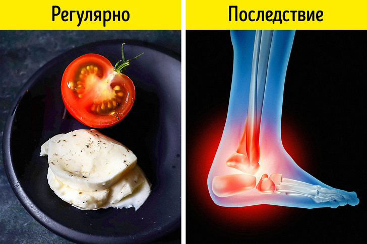 Піца «Маргарита», гарячі бутерброди, салати — поєднання сиру з помідорами класичне, і здається, що шлунок сприймає його чудово. Але одночасне вживання цих продуктів має відстрочені негативні наслідки — провокує утворення нерозчинних кристалів мінеральних солей. Ці кристали відкладаються в суглобах, що може проявлятися болями і обмеженням їх рухливості.