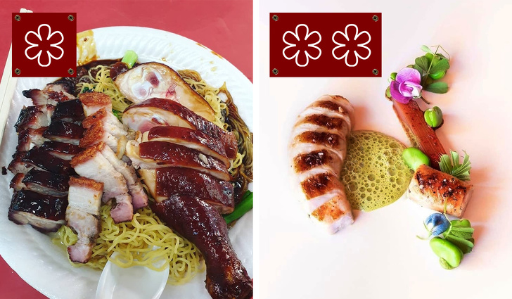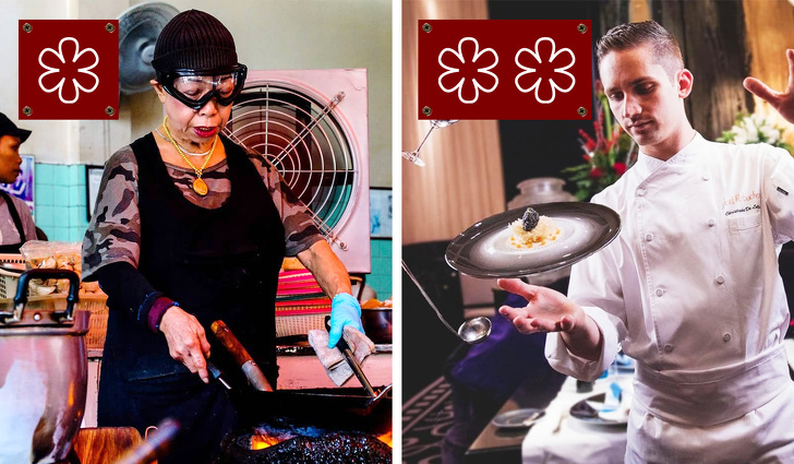 - Заклади зі стріт-фудом теж отримують мішленівські зірки. Всі вони знаходяться в Азії: Сінгапурі, Гонконзі, а нещодавно, у 2017 році, до них приєднався ресторан Jai Fay в столиці Таїланду Бангкоку. Всі страви в ньому готує сама Джей Фай — Тітонька Кріт. Ця поважна китайська бабуся в лижних окулярах і шапочці (її фішка) винайшла свій фірмовий омлет з крабом, за що вона і отримала свою зірку.