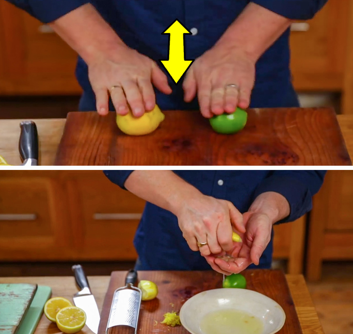 - Кращий спосіб отримати більше соку лайма чи лимона — попередньо нагріти. Якщо ж з якоїсь причини ви не можете цього зробити, то покладіть цитрус на рівну поверхню і катайте, як ніби хочете зробити з нього ковбаску, близько 20 секунд. Потім розріжте і видавлюйте сік — його буде значно більше.
