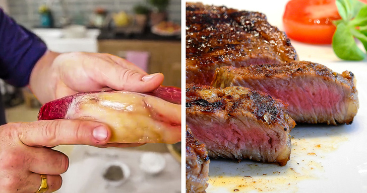 - Якщо ви хочете, щоб ваш стейк виглядав підрум'яненим, але при цьому був середньої прожарки, вам слід звернути увагу на дабл-стейк — шматок товщі звичайного в 2 рази. Він буде виглядати підсмажений, а всередині збереже необхідний вам колір і текстуру. До речі, яловичину, яку ви плануєте запікати, теж можна спочатку трохи обсмажити на сковорідці до утворення красивою золотисто-коричневої скоринки.