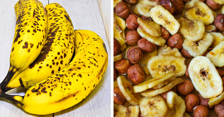 - Потемнілі банани можна очистити, порізати, викласти на деко і запікати при невисокій температурі. Коли вони охолонуть, складіть їх у банку — їх можна їсти як чіпси або додавати в кашу.