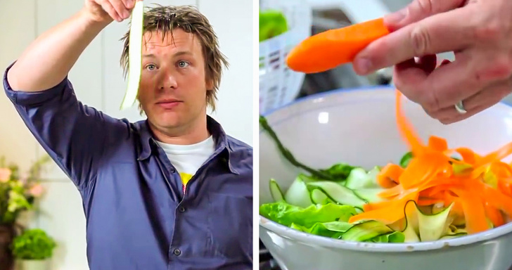 Незвичайний спосіб тонко нарізати огірки та моркву для салату — скористатися овочечисткою. Джеймі стверджує, що з такою нарізкою будь салат буде виглядати як від шефа.