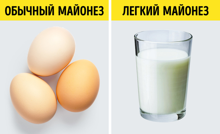 Всі знають, що майонез — це не кращий вибір для тих, хто хоче зберегти струнку фігуру. Проте існує спосіб зробити його більш легким: для цього досить замінити яйця звичайним молоком. Візьміть ваш улюблений рецепт домашнього майонезу і додайте замість яєць молоко — його кількість повинна бути в 2 рази менше, ніж кількість масла. Так ви отримаєте не менш смачний, але набагато більш корисний соус.