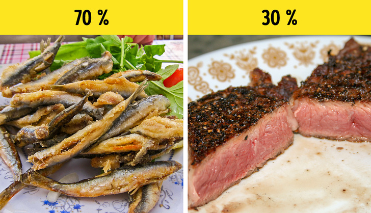 У звичному «тваринний» раціоні приблизно 70 % становить риба і тільки 30 % — м'ясо