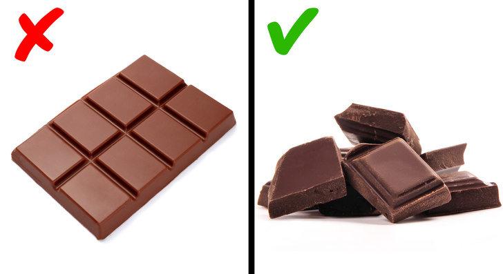 Щоб обдурити мозок, кожну солодкість, яку ви збираєтеся з'їсти, ділите на шматочки. Наприклад, ви можете з'їсти цілу смужку від плитки шоколаду, і мозок сприйме її як одну одиницю. А можете поділити її на квадратики, і тоді вийде вже 4-5 шматочків. Кількість буде одним і тим же, але морального задоволення куди більше.
