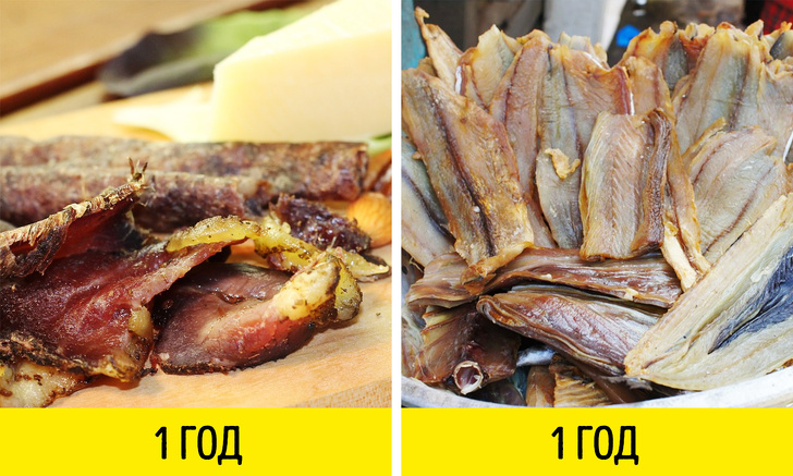 В'ялене м'ясо і риба також чудово доповнюють домашні запаси: вони займають небагато місця, можуть бути приготовані самостійно і довго зберігаються. Якщо в'ялений продукт приготований вдома і лежить у коморі, його термін придатності закінчиться через пару місяців, однак в герметичній вакуумній упаковці термін зберігання збільшується до року.