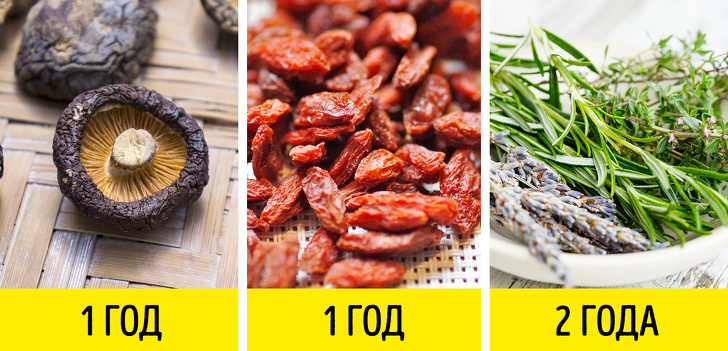 Сушені продукти зручні тим, що займають небагато місця, а після невеликого замочування знову набувають свіжий смак. Після сушіння гриби повинні зберігатися в герметичному контейнері або міцному пакеті, щоб до них не добрався їх головний ворог — комахи. Такі гриби можна зберігати рік і більше. Стільки ж можна зберігати і засушені ягоди — поки вони не втратять колір або у них не з'явиться неприємний запах.