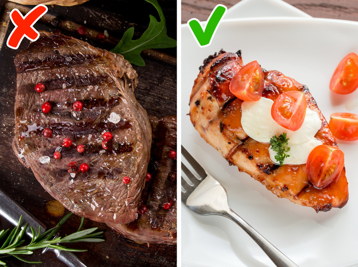 Якщо ви не готові відмовитися від м'яса, намагайтеся вибирати такі продукти і страви, де воно зазнавало мінімуму обробки. І краще перенесіть рясні м'ясні обіди на вихідні.
