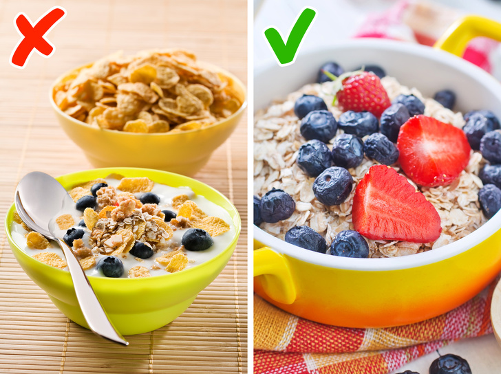 Щоб зробити перший прийом їжі здоровіше, включіть в раціон каші на воді або молоці, а пластівці замініть мюслі без цукру. В якості добавок до них можна використовувати горіхи і сухофрукти.