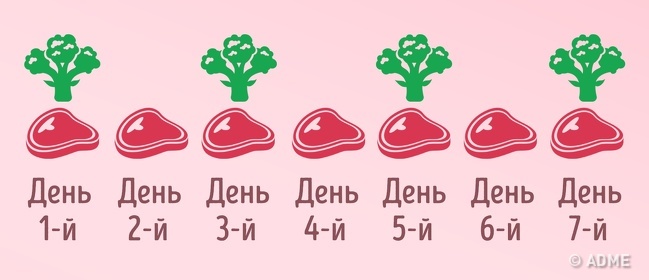 - 1 день білковий, потім 1 день — овочі + білки.