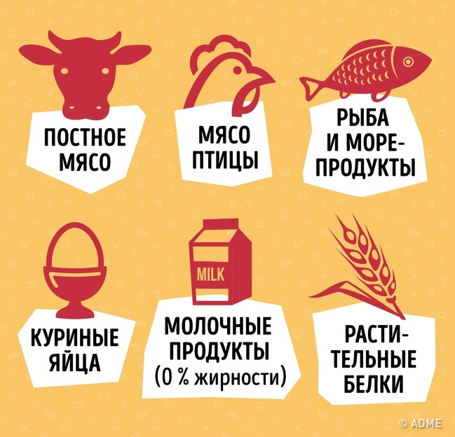 Ось повний список 72 білкових продуктів. У нього входять майже всі види м'яса, риби, морепродуктів і вся молочна продукція з жирністю 0 %.