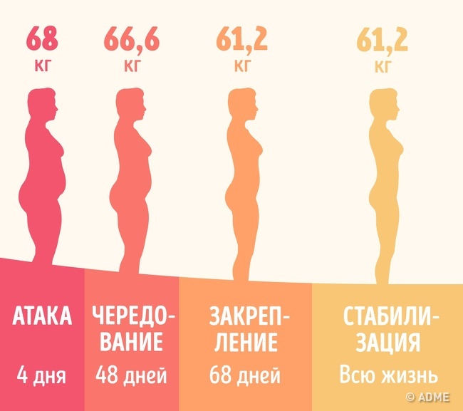 Тривалість етапу. Його тривалість залежить від втраченої ваги за 1-й етап: 1 кг схуднення під час атаки = 10 днів чергування. Наприклад, якщо ви втратили на 1-му етапі 3 кг, то тривалість чергування становитиме 30 днів.