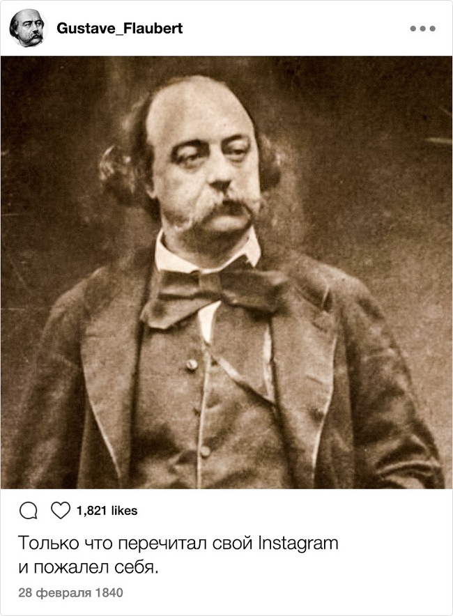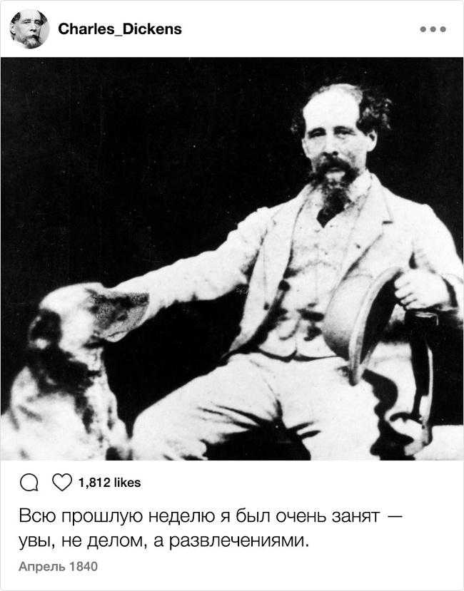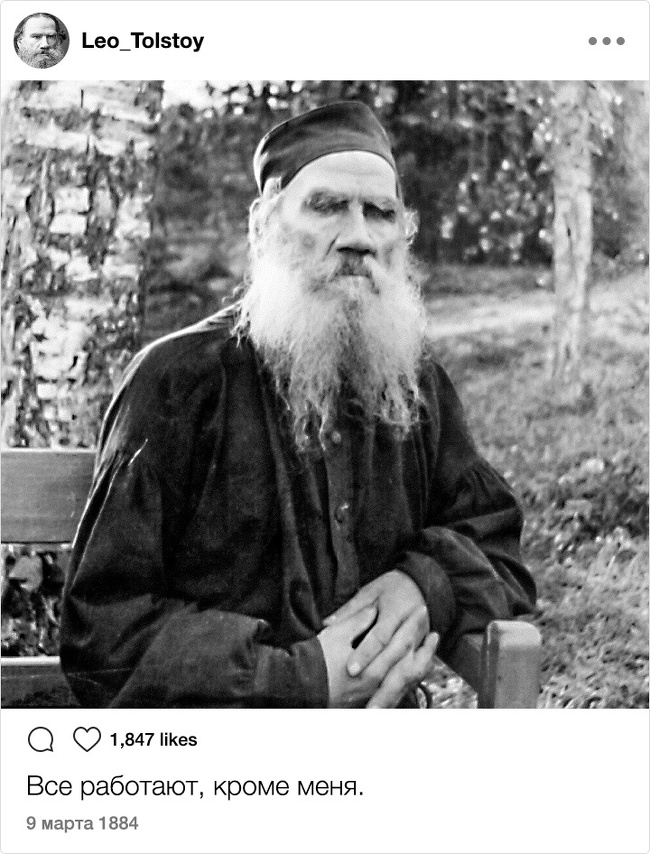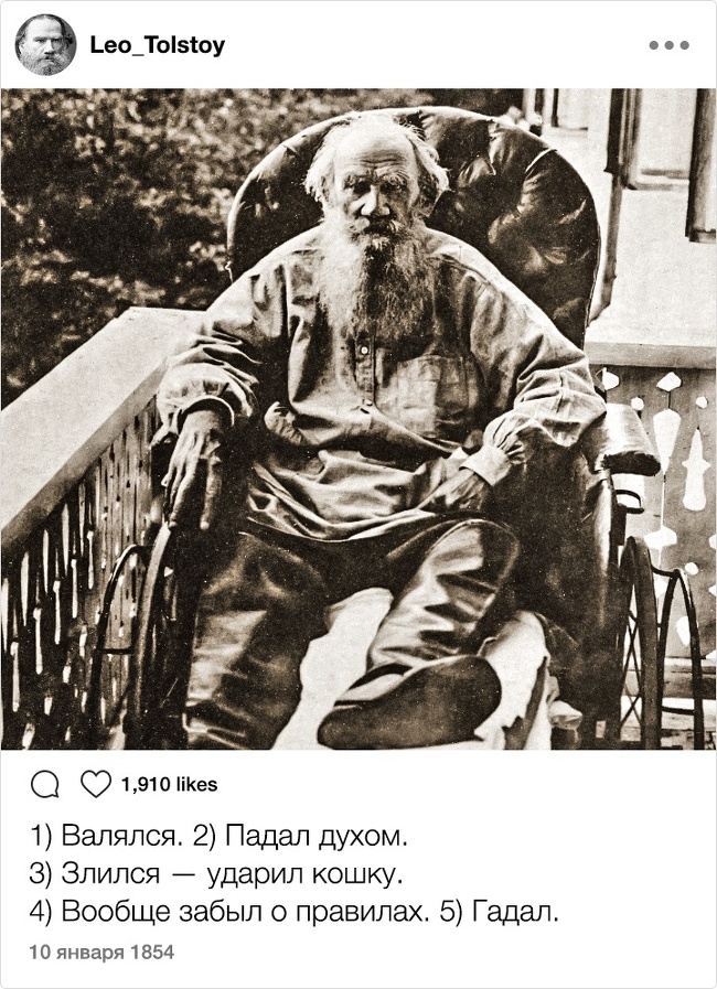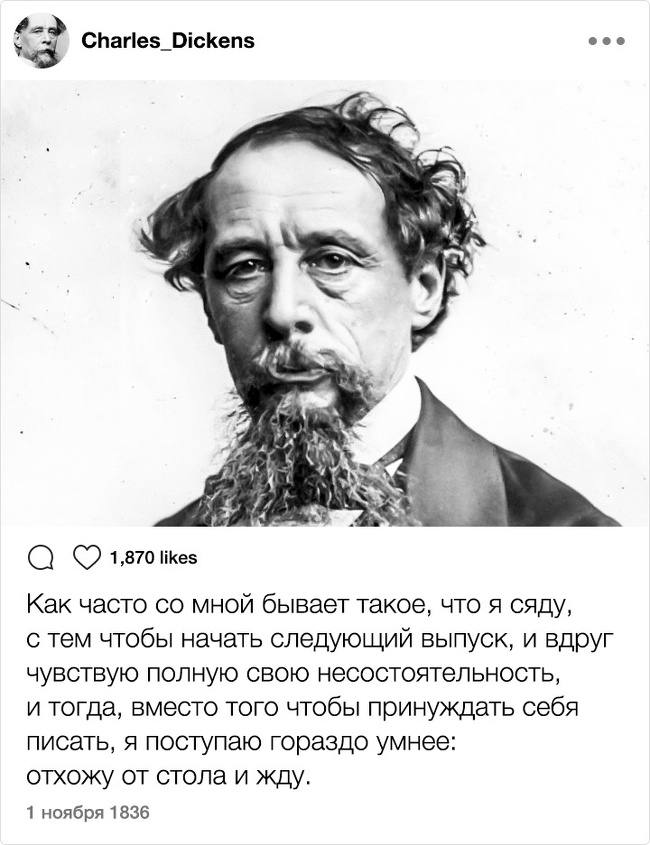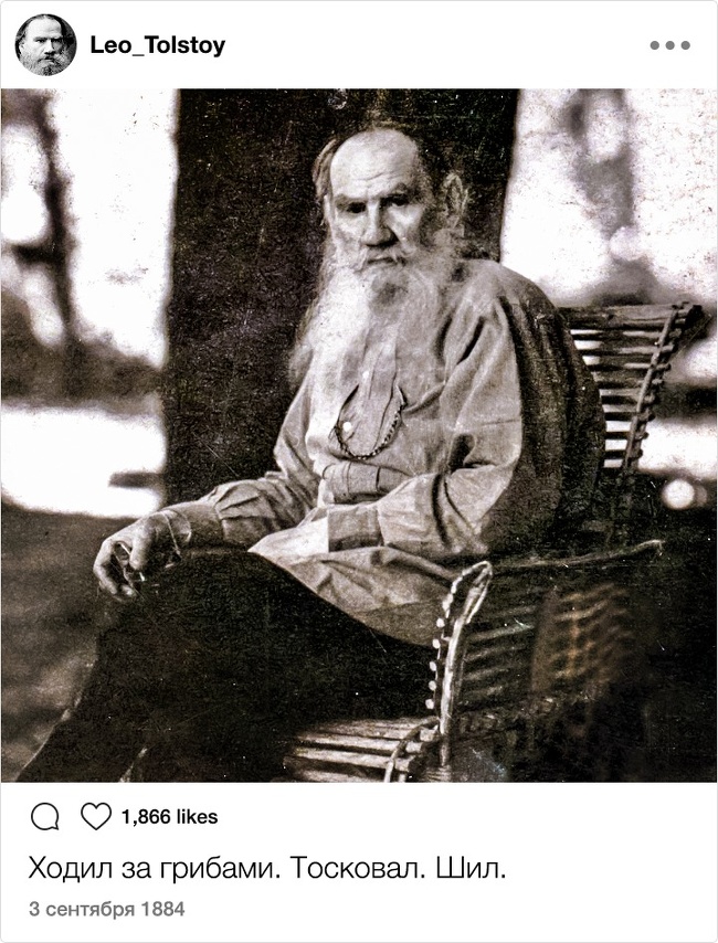 Тільки уявіть собі: XIX століття. Instagram. Відомі письменники. Здавалося б, таке поєднання могло призвести до народження нових жанрів і публікації бессметного кількості так і не видані авторами творів. Але є і друга ймовірність розвитку подій: письменники як звичайні земні люди могли б писати в мережі про свою лінь, тузі і взагалі кидати цікаві замітки ні про що. Який розклад теоретично був би більш імовірним?