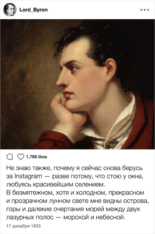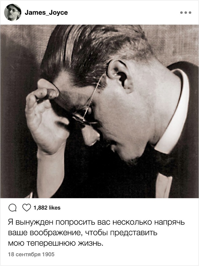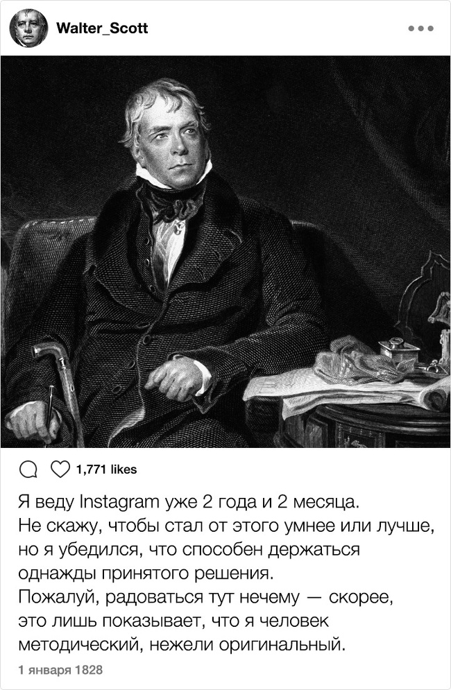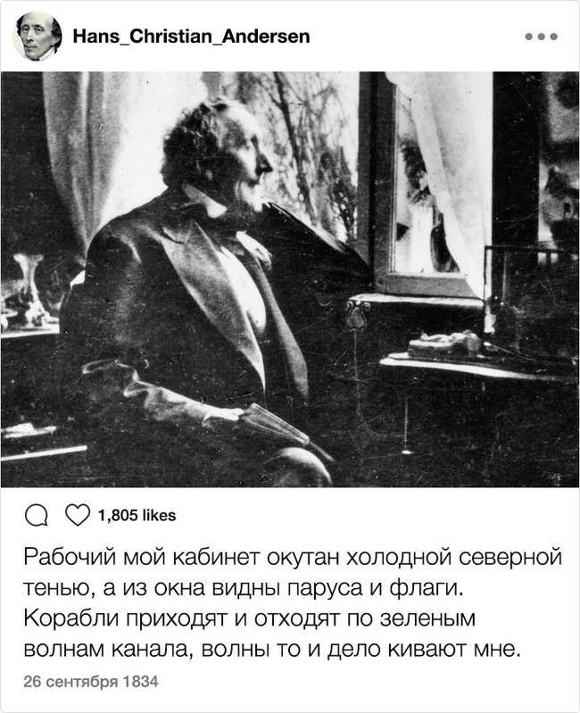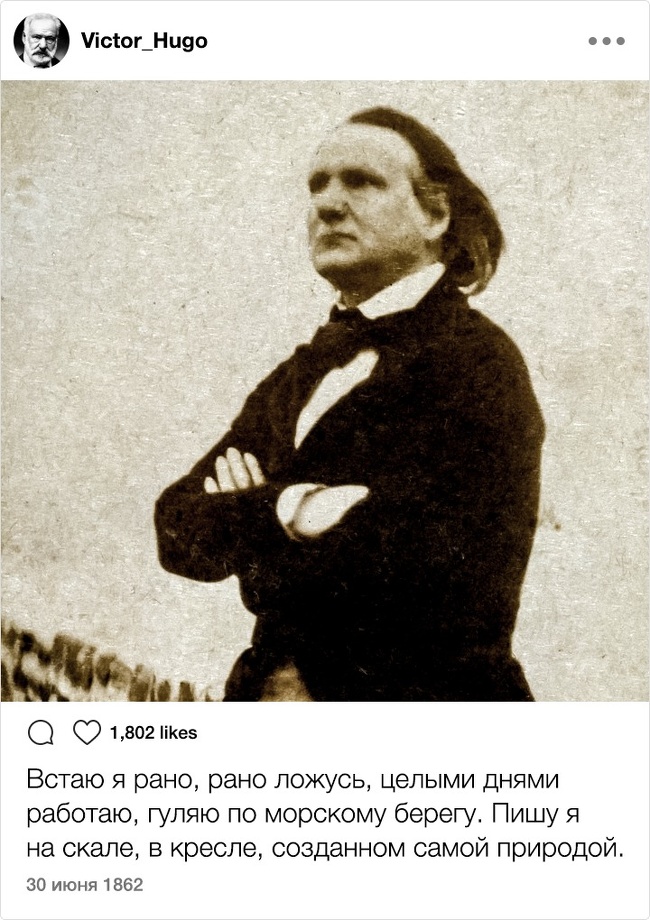 Тільки уявіть собі: XIX століття. Instagram. Відомі письменники. Здавалося б, таке поєднання могло призвести до народження нових жанрів і публікації бессметного кількості так і не видані авторами творів. Але є і друга ймовірність розвитку подій: письменники як звичайні земні люди могли б писати в мережі про свою лінь, тузі і взагалі кидати цікаві замітки ні про що. Який розклад теоретично був би більш імовірним?