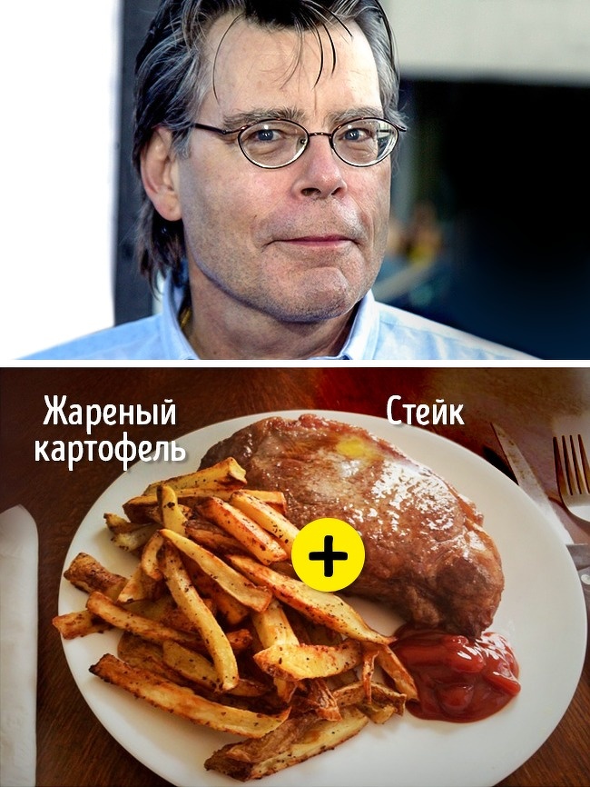 Обід "короля жаху і страху" складається з двох дуже ситних продуктів - м'яса і картоплі. Після обіду письменник налаштовується на роботу за чашкою кави з шматочком домашнього чізкейку.