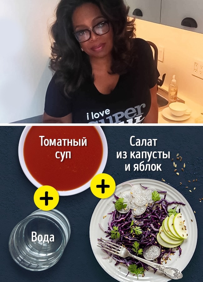 Ікона американського телебачення пропагує правильне харчування і уникає випадкових перекусів, тому обід Опри незмінний: суп і салат. Кулінарний раціоналізм знаменитої телеведучої одного разу допоміг їй скинути 28 кг і поправити емоційне здоров'я.