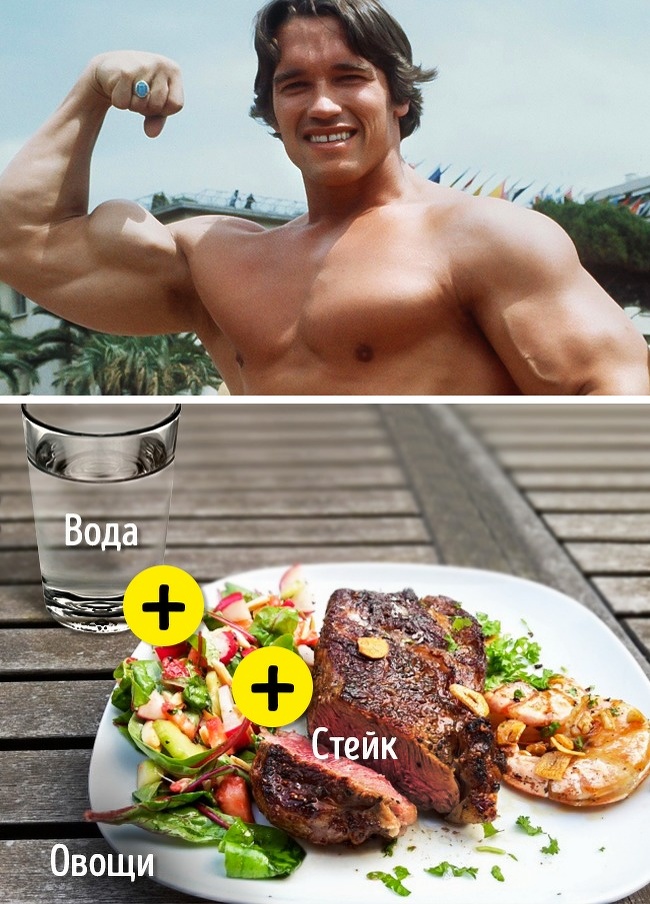 Незважаючи на поважний вік, жива легенда спорту досі дотримується власної дієти: набір маси + втрата жиру. "Залізний Арні" вміло поєднує в раціоні білки, жири і вуглеводи.