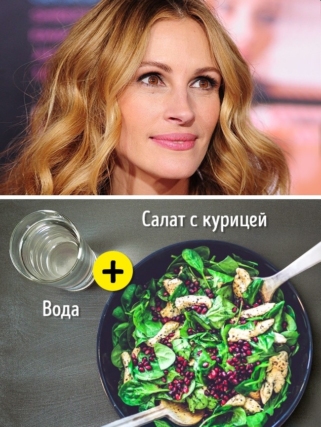 Володарка самої красивої посмішки впевнена, що корисність їжі залежить не від кількості калорій, а від емоцій, які вона викликає. Тому вечорами актриса дозволяє собі печиво з шоколадною крихтою і келих вина.