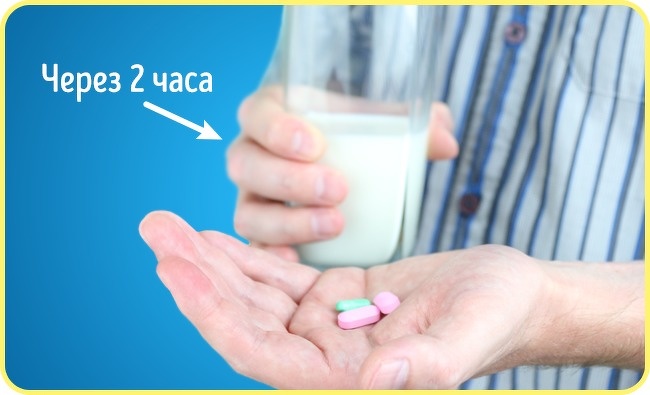 З антибіотиками групи тетрацикліну, пеніциліну і азитроміцину молоко формує нерозчинні сполуки, в результаті чого значно знижується ефективність препаратів. Вживати молоко і продукти з нього можна не тільки під час прийому препарату, але і за годину до / після цього. А ось протизапальні нестероїдні засоби типу аспірину не тільки можна, але і потрібно запивати молоком.