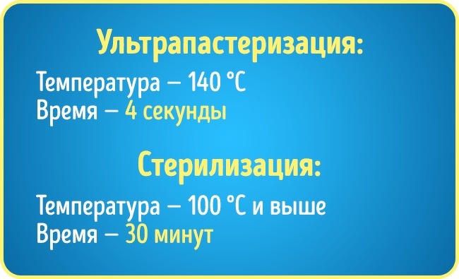 Не варто плутати ультрапастеризацию зі стерилізацією. Стерилізоване молоко піддається тривалому кип'ятінню, в результаті чого в ньому руйнується левова частка поживних речовин.