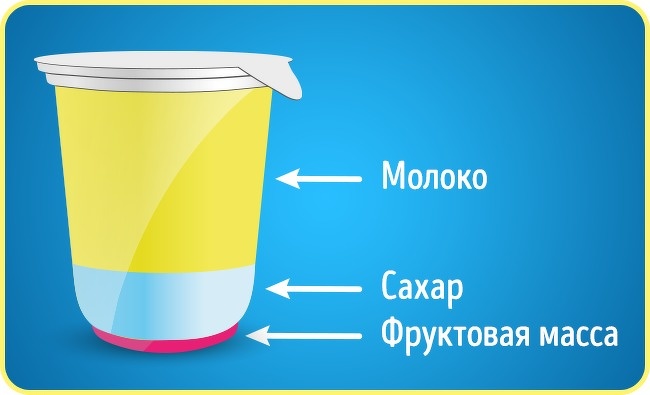 Фрукти в йогурті - це фруктова маса, до складу якої крім самих фруктів входять не самі корисні консерванти, стабілізатори, барвники, ароматизатори. При цьому за кількістю цукру фруктовий йогурт може змагатися з такими продуктами, як кока-кола або пампушки. Для порівняння, в них міститься близько 10 % цукру, у деяких фруктових йогуртах - до 18 %.
