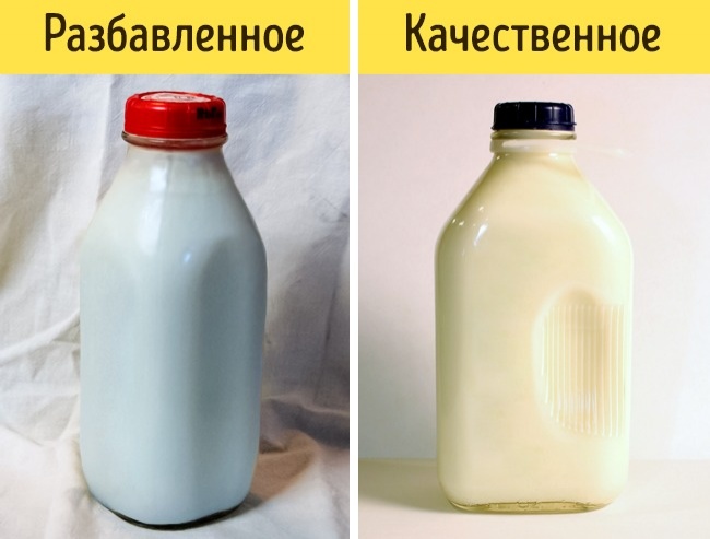 - Якщо молоко продається в скляній пляшці, то визначити його якість можна ще до покупки. Гарне молоко повинно бути густим, чистого білого кольору. Якщо ж ви помітили голубуватий відтінок, то його, безсумнівно, розбавляли водою.