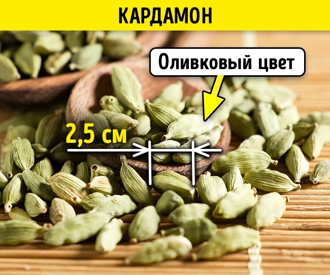 - Коробочки кардамону повинні бути великі, колір — оливковий або зеленуватий. Яскраво-зелений колір може говорити про наявність штучних барвників, а жовтуватий, охристий колір — про те, що сушили кардамон неправильно або він дуже старий.