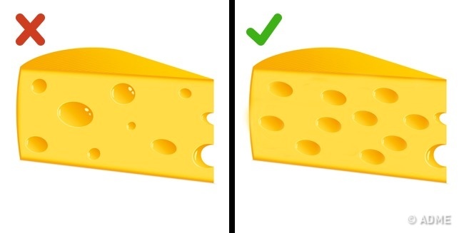 При купівлі твердого сиру потрібно звертати увагу на кілька моментів: колір повинен бути рівномірним, без прожилок і білого нальоту на скоринці; очі повинні бути однаковими за розміром на всьому шматку і розподілені рівномірно; пружність — якщо натиснути на сир і він не прийме форму назад, то його краще не брати.