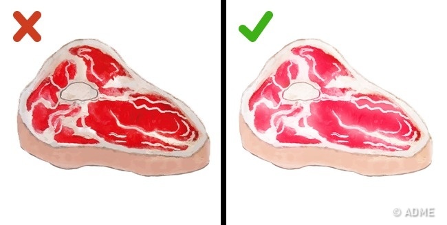 Колір у свіжого м'яса повинен бути ніжно-рожевий, ніяк не бурий. Зверніть увагу на жирові прошарки: вони повинні бути блискучими і максимально світлими. За структурою м'ясо повинно добре піддаватися деформації (повертатися в первісний вигляд) і не повинно липнути до рук.