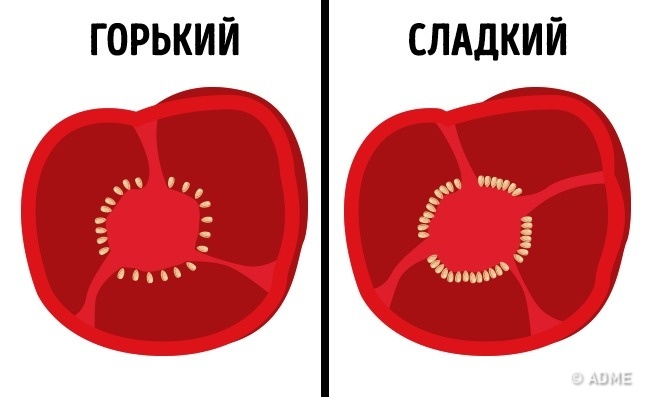 Болгарський перець з 2-3 поділами буде гіркуватим і з меншою кількістю насіння. Якщо поділів 4 — плід солодкий і з великою кількістю зерен. У неразрезанном вигляді варто звертати увагу на горбки перцю знизу.