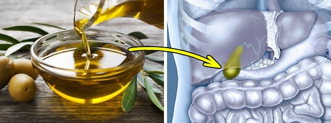 Вживання оливкової олії з фруктовим соком допомагає вивести камені з жовчного міхура. Також воно сприяє зниженню рівня холестерину в крові і жовчному міхурі.